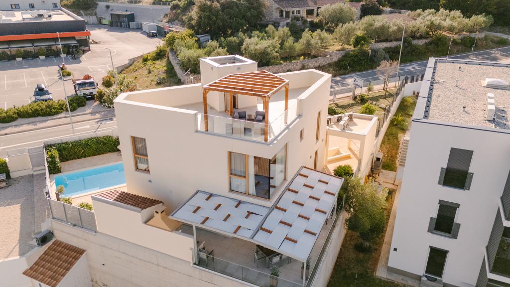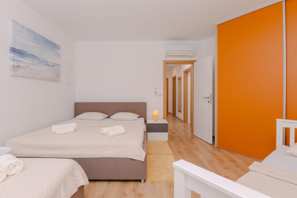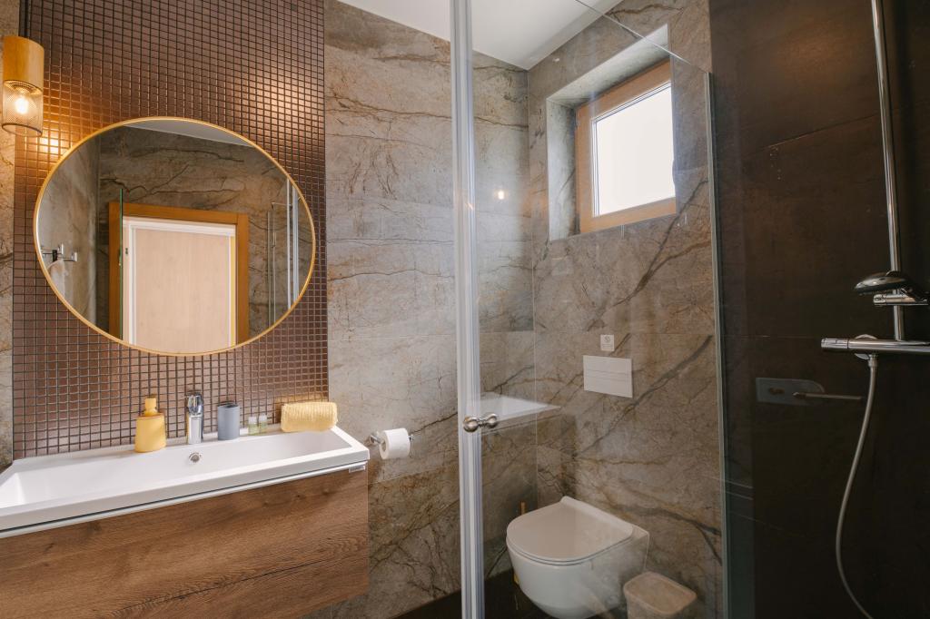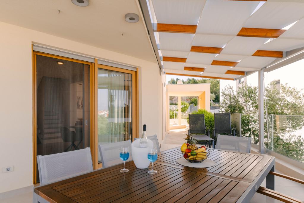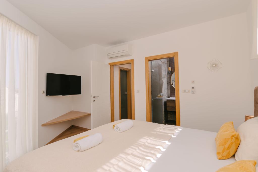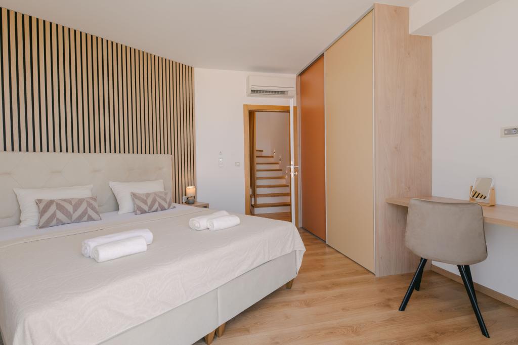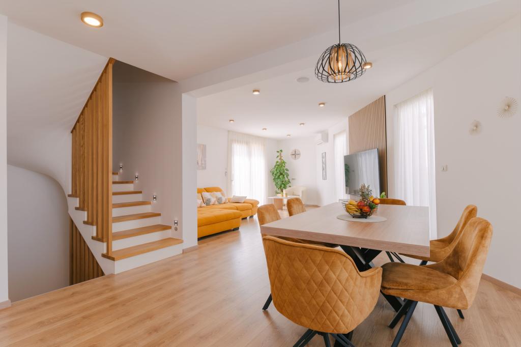 Tres modernos dormitorios principales se encuentran en la planta superior, mientras que una habitación de invitados se encuentra en el sótano. Todos los baños están equipados con grifería Grohe y Laufen de primera calidad, azulejos de cerámica de diseño prestigioso y elegantes puertas de cristal. La casa está oficialmente clasificada por el Ministerio de Turismo de la República de Croacia, lo que permite alojar cómodamente a 9 o incluso 10 huéspedes. La sala de estar y el comedor, así como cada dormitorio, están equipados con aire acondicionado individual con modo silencioso, perfecto para un sueño reparador. La moderna cocina, de la famosa marca austriaca DanKüchen, está totalmente equipada con electrodomésticos de alta gama, incluyendo un refrigerador con máquina de hielo y un dispensador de agua fría.