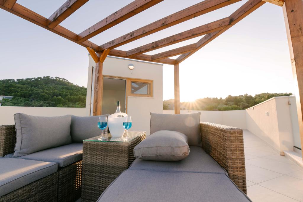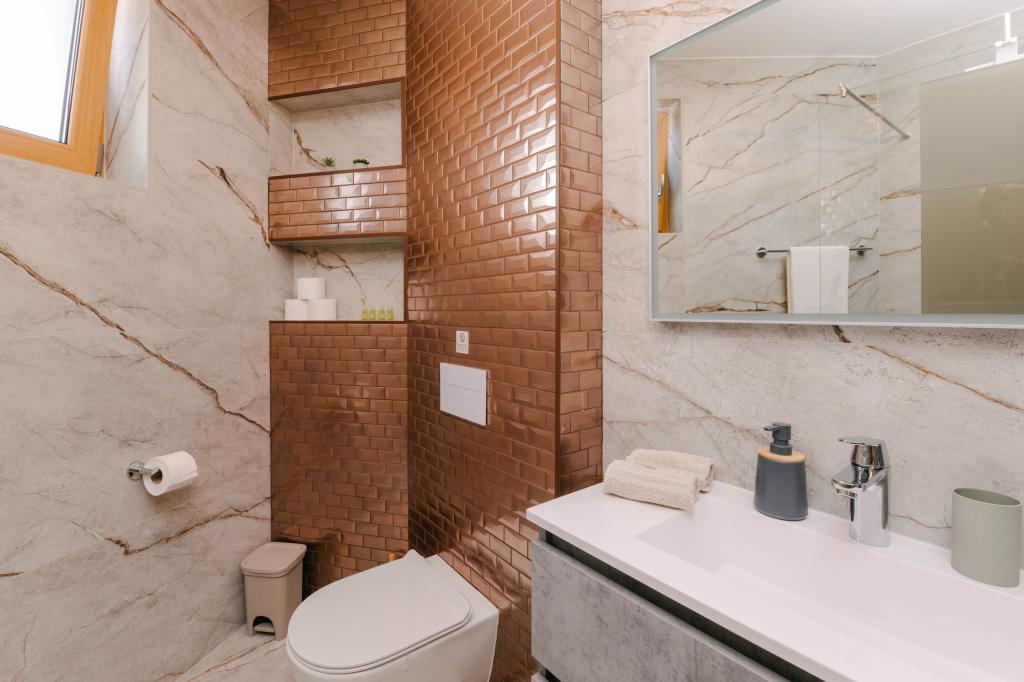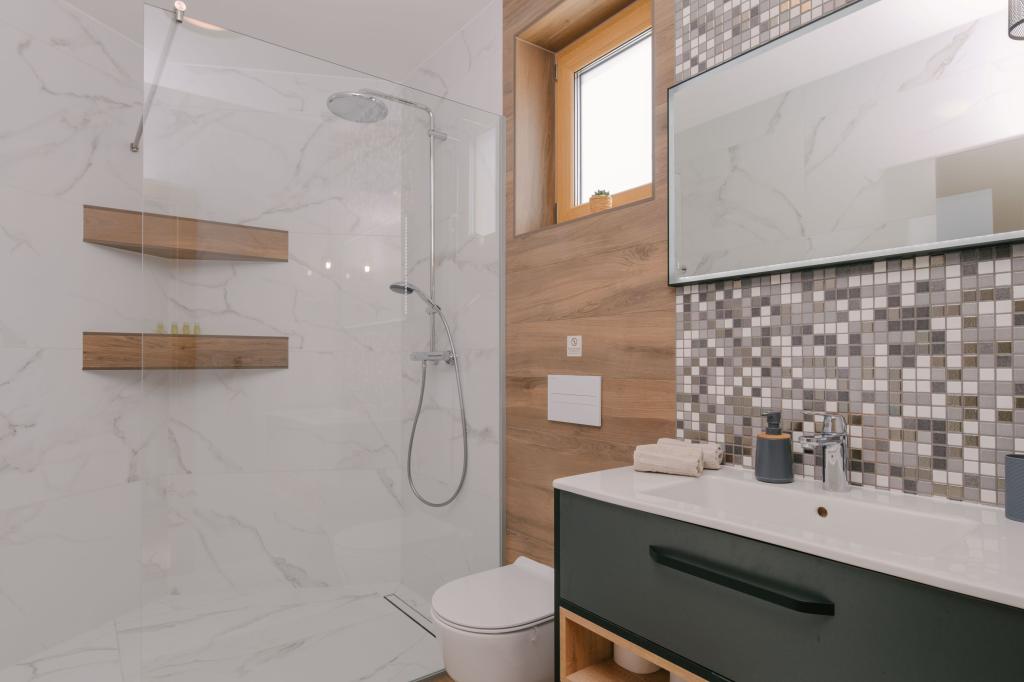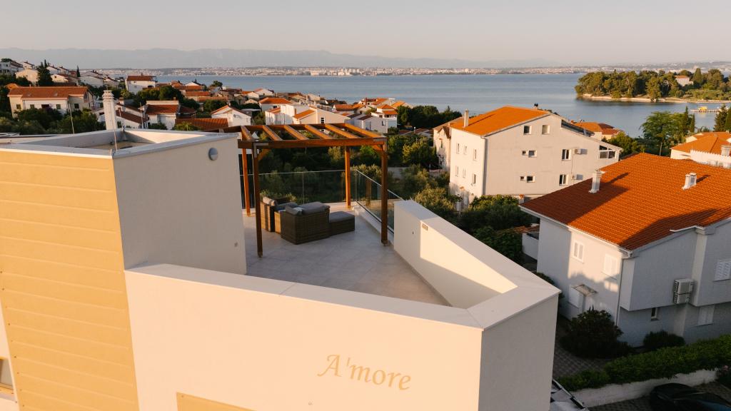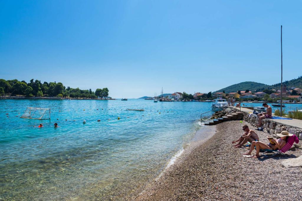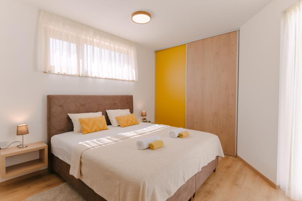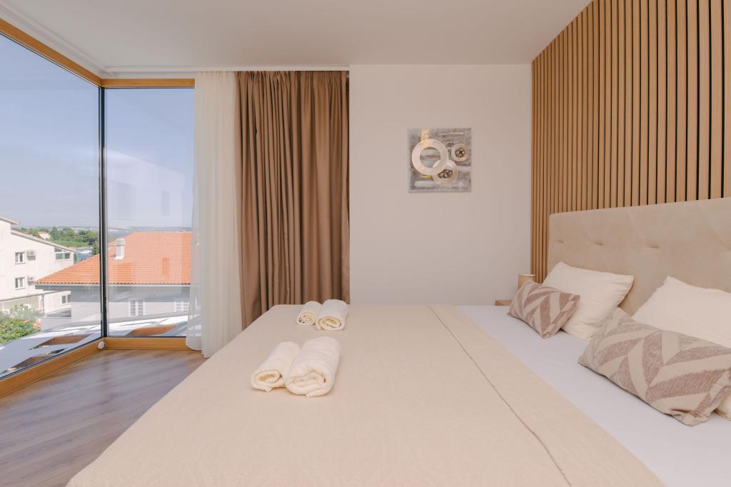 Tres modernos dormitorios principales se encuentran en la planta superior, mientras que una habitación de invitados se encuentra en el sótano. Todos los baños están equipados con grifería Grohe y Laufen de primera calidad, azulejos de cerámica de diseño prestigioso y elegantes puertas de cristal. La casa está oficialmente clasificada por el Ministerio de Turismo de la República de Croacia, lo que permite alojar cómodamente a 9 o incluso 10 huéspedes. La sala de estar y el comedor, así como cada dormitorio, están equipados con aire acondicionado individual con modo silencioso, perfecto para un sueño reparador. La moderna cocina, de la famosa marca austriaca DanKüchen, está totalmente equipada con electrodomésticos de alta gama, incluyendo un refrigerador con máquina de hielo y un dispensador de agua fría.