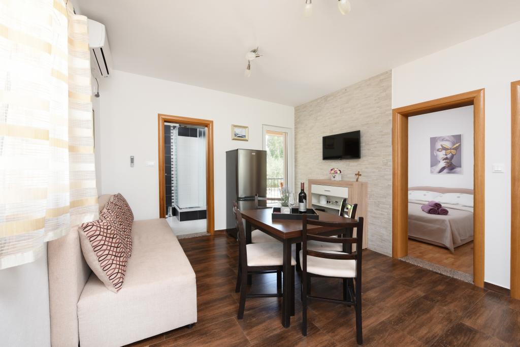La casa de vacaciones está situada en una zona tranquila de Pridraga, rodeada de vegetación y pájaros cantando. Hay una piscina y un parque infantil al lado de la casa. Hay que ir a la playa en coche.