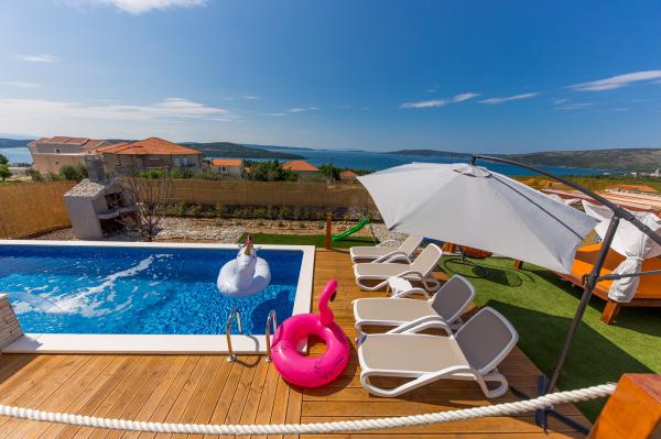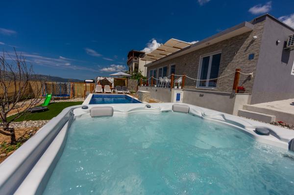 VILLA HEDONIST se encuentra en Seget Vranjica a 3 km de Trogir. Cuenta con 5 baños, 4 habitaciones, sauna finlandesa, gimnasio, sala, cocina y comedor. Cada habitación tiene su propio cuarto de baño y TV vía satélite, aire acondicionado, caja fuerte, armario ... en frente de la casa hay una piscina de 28 m2 con 6 armarios y una cama de madera con rebosadero. Jacuzzi junto a la piscina para 5 personas. En el jardín hay un césped artificial con un área de juegos para niños, camas elásticas, columpios, toboganes y barbacoas. Detrás de la casa hay un aparcamiento para 3 coches.